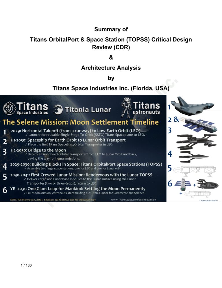 The contents of this CDR Document, including but not limited to, proprietary designs, specifications, methodologies, business plans, financial projections, infrastructure concepts (such as the Titans Spaceplane, the Titans OrbitalPort & Space Station (TOPSS), and global spaceport/facility plans), text, graphics, and data, are protected by United States and international copyright laws.