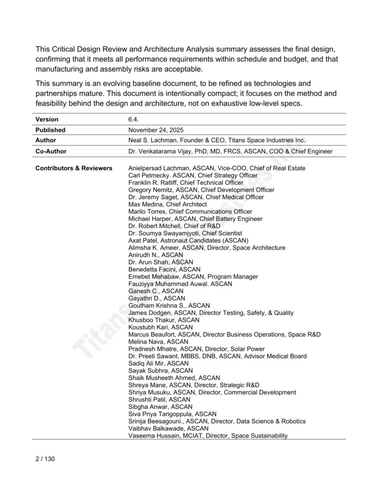 This Critical Design Review (CDR) and Architecture Analysis Summary, including all exhibits, annexes, attachments, and any subsequently provided supplementary materials (collectively, the “CDR Document”), is the exclusive intellectual property of Titans Space Industries Inc. (“TSI”).